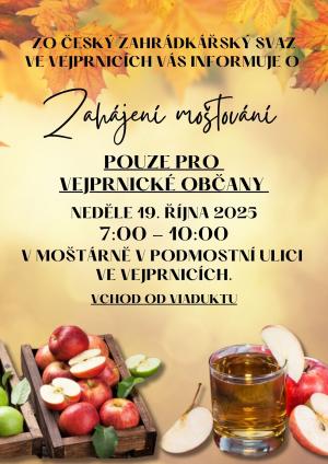 Dovolujeme si Vás informovat, že v neděli 19.10.2025 od 7:00 do 10:00 proběhne moštování pro vejprnické občany v Podmostní ulici ve Vejprnicích (vchod od viaduktu)
