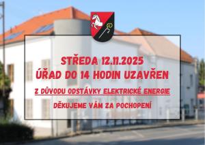 Dovolujeme si Vás informovat, že obecní úřad bude 12.11.2025 uzavřen do 14 hodin z důvodu přerušení dodávky elektrické energie. Děkujeme Vám za pochopení.