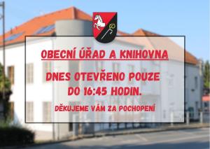 Dovolujeme si Vás informovat, že dnes, 26.11.2025, bude knihovna a obecní úřad otevřen pouze do 16:45. Děkujeme Vám za pochopení.