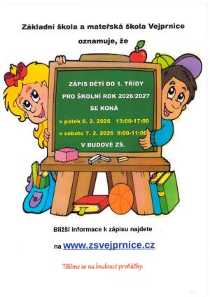 Základní škola a mateřská škola Vejprnice oznamuje, že se bude konat zápis dětí do 1. třídy pro školní rok 2026/2027 v pátek 6.2.2026 od 13:00 do 17:00 a v sobotu 7.2.2026 od 9:00 do 11:00 v budově ZŠ.