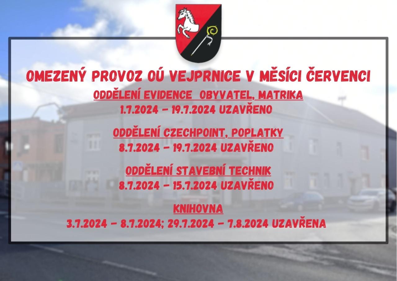 Dovolujeme si Vás informovat o provozu OÚ Vejprnice v měsíci červenci.