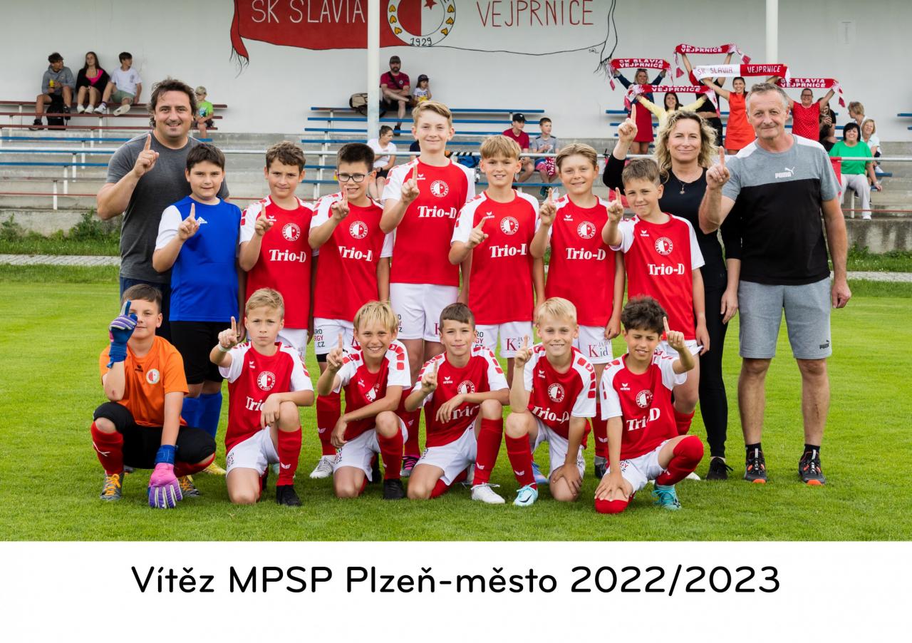 Vítězem Městského přeboru starších přípravek 2022/2023 se zaslouženě stal tým starší přípravky SK Slavia Vejprnice. Děkujeme našim skvělým trenérům Václavu Štefánkovi, Jakubovi Fialovi a kustodce týmu Heleně Štefánkové za perfektní vedení našich malých fotbalistů a trpělivou práci na jejich systematickém rozvoji. Velký dík patří všem našim fanouškům, kteří zejména na finálním domácím zápase vytvořili nezapomenutelnou atmosféru. Celému týmu přejeme další úspěchy ve fotbalové kariéře!
