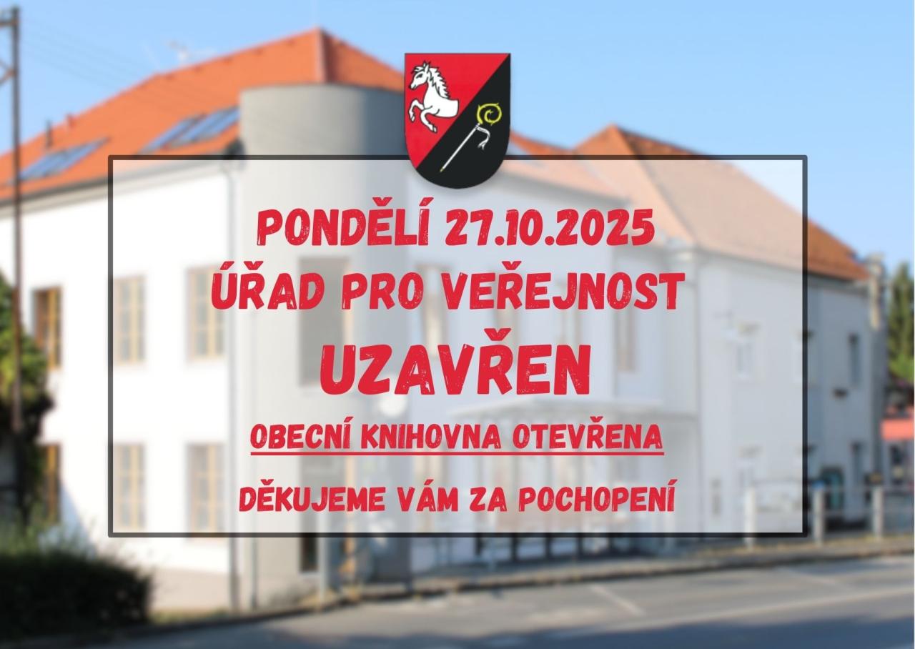 Dovolujeme si Vás informovat, že v pondělí 27.10.2025 bude úřad pro veřejnost uzavřen. Obecní knihovna Vejprnice bude klasicky otevřena dle otevírací doby. Děkujeme Vám za pochopení.
