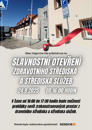 Obec Vejprnice Vás srdečně zve na slavnostní otevření zdravotního střediska a střediska služeb, které se uskuteční 24.9.2025 od 16 hodin.