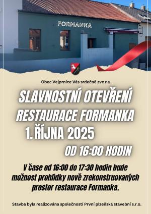Obec Vejprnice si Vás dovoluje pozvat na slavnostní otevření restaurace Formanka, které se uskuteční 1.10.2025 od 16 hodin.