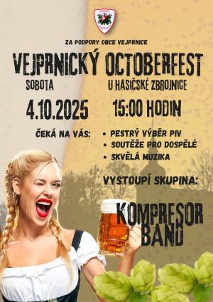 Sbor dobrovolných hasičů Vejprnice za podpory obce Vejprnice pořádají 3. Vejprnický octoberfest, který se uskuteční 4.10.2025 od 15 hodin u hasičské zbrojnice. Čeká na Vás pestrý výběr piv, skvělá muzika a mnoho dalších.