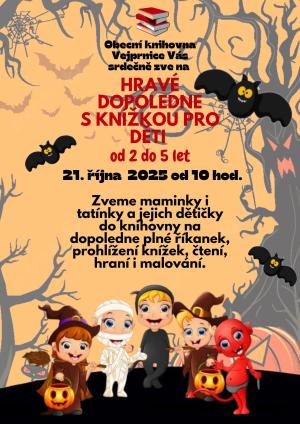 Obecní knihovna Vejprnice Vás zve na tradiční Hravé dopoledne s knížkou pro děti od 2 do 5 let, které se uskuteční 21.10.2025 od 10 hodin v knihovně.
