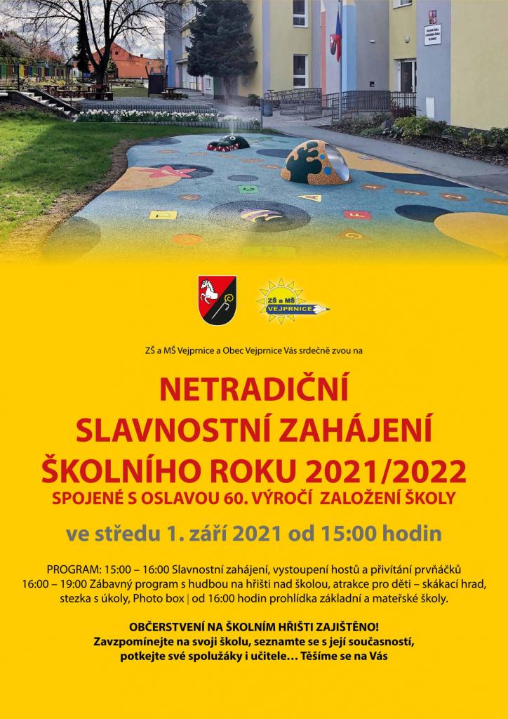 ZŠ a MŠ Vejprnice a Obec Vejprnice Vás srdečně zvou na netradiční slavnostní zahájení školního roku 2021/2022 spojené s oslavou 60. výročí založení školy.