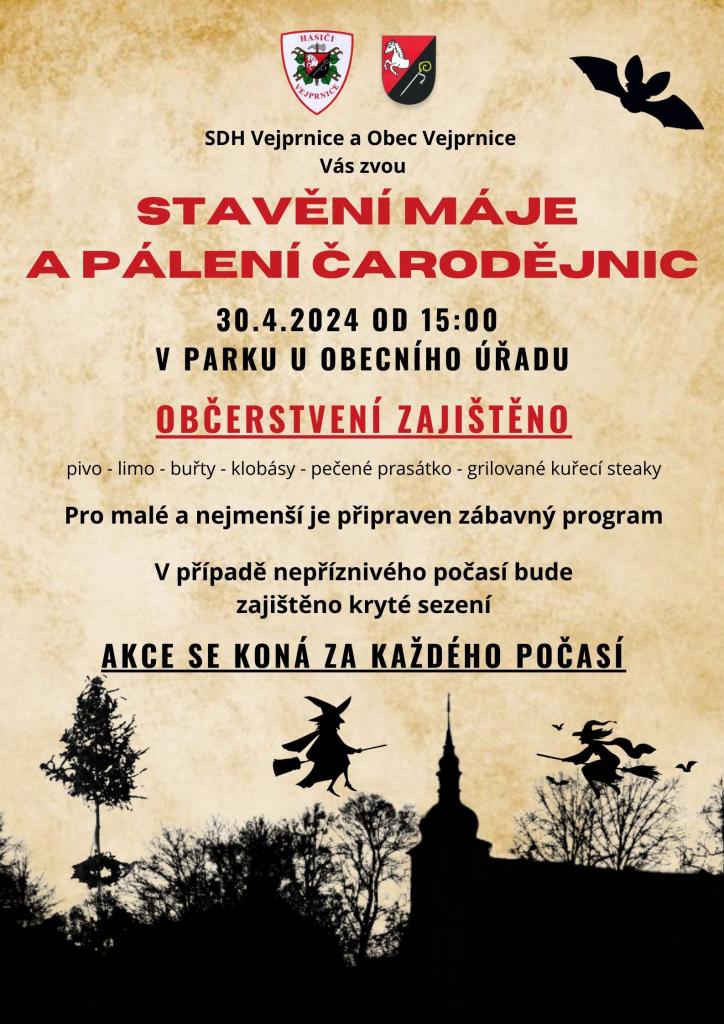 SDH Vejprnice a obec Vejprnice Vás srdečně zvou na Stavění máje a pálení čarodějnic, které se uskuteční 30.4.2024 od 15 hod. a to v parku u OÚ Vejprnice.