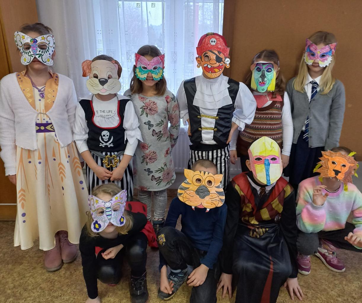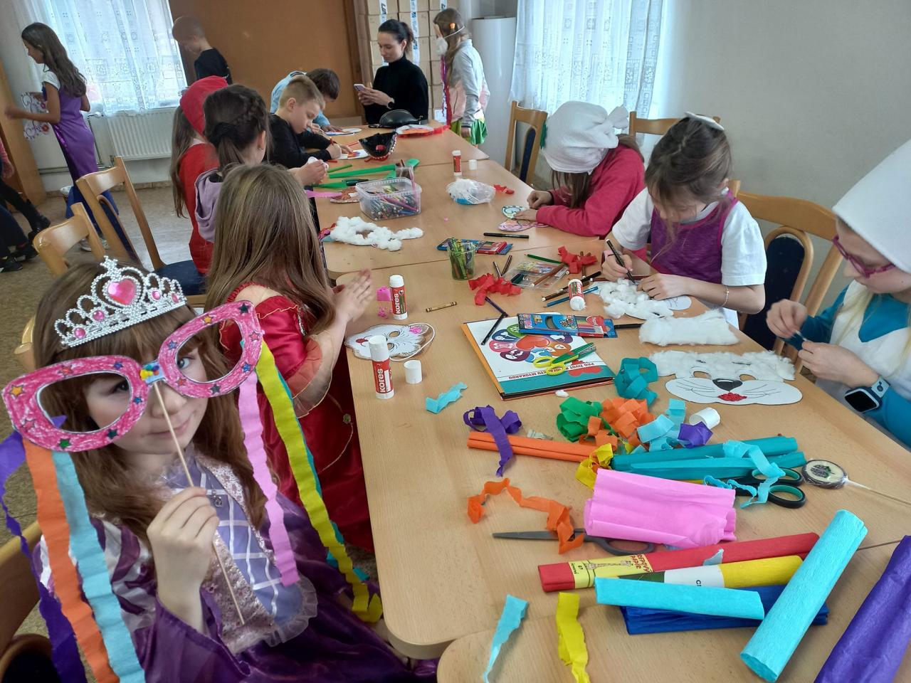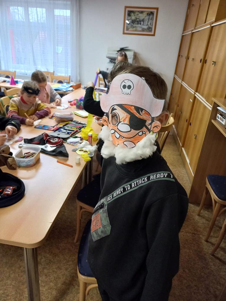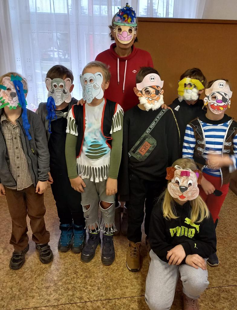 Žáci druhých ročníků si den před masopustním průvodem přišli do knihovny vyrobit papírové masky,